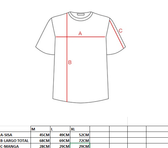 Mira nuestra tabla de medidas que esta a continuacion y comparala con la remera que te quede mas comoda! Te recomendamos que para tomar las medidas la apoyes en una mesa.