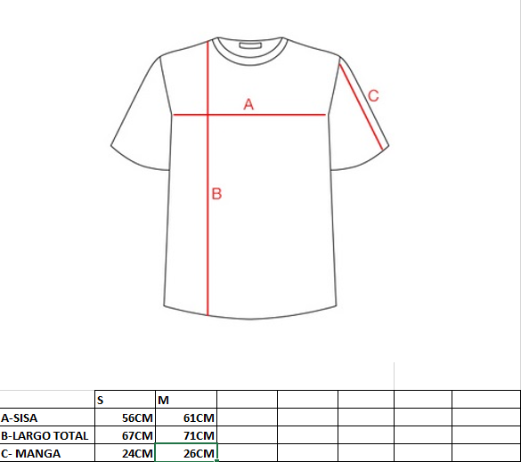 Mira nuestra tabla de medidas que esta a continuacion y comparala con la remera que te quede mas comoda! Te recomendamos que para tomar las medidas la apoyes en una mesa.